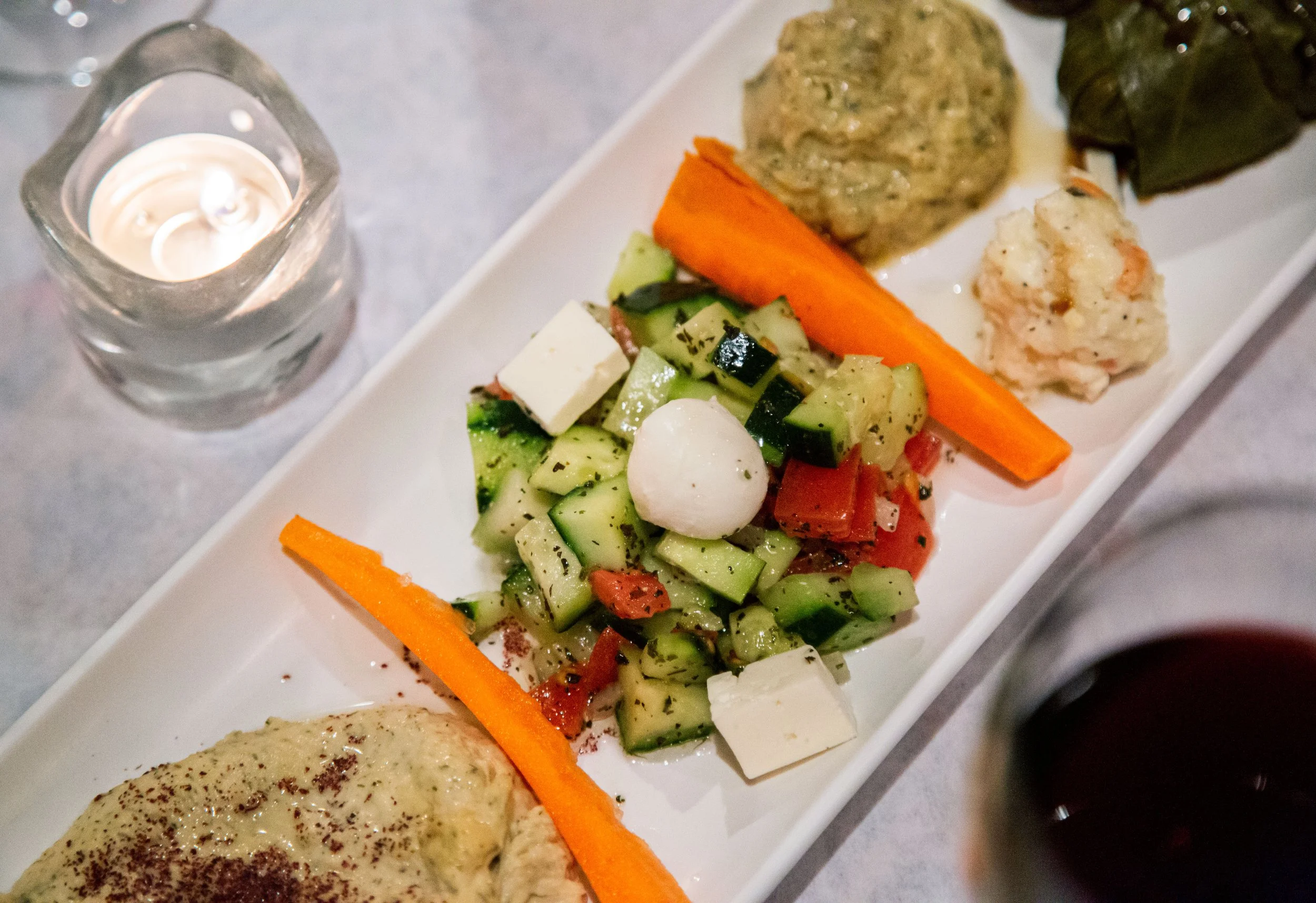 Hummus, baba ghanouj, falafel, dolmeh, tapenade, shirazi salad, cut vegetables