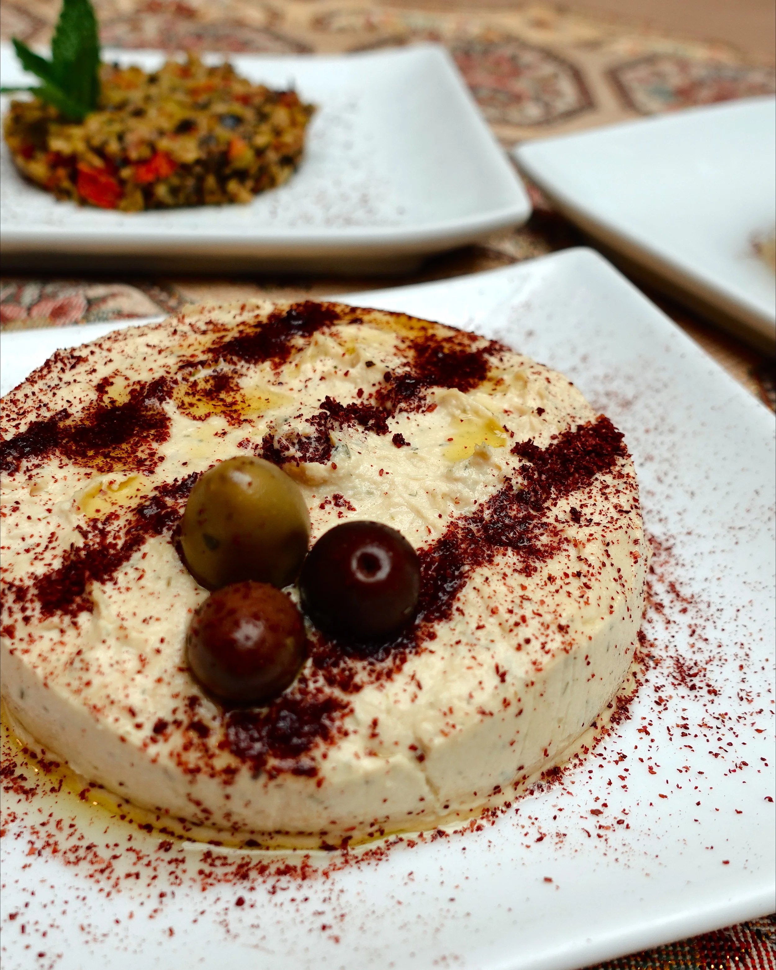 Pureed chickpeas, tahini, garlic, lemon, virgin olive oil, cut vegetables